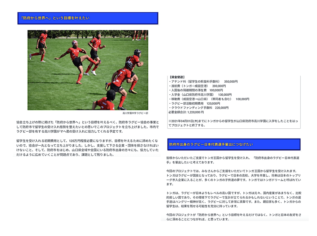 下記のようにクラウドファンディングを立ち上げました。皆様のお理解とご支援ご協力を賜りますようお願い申し上げます。https://readyfor.jp/projects/houfu_rugby?fbclid=IwAR2kUTXhw5anUwuQrX5xudw_HZJZTolLDVQ32_CogaXVTWgurQHNmh9oxKE