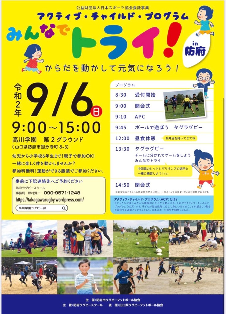 9月6日(日)、山口県ラグビー協会の後援をいただき、防府市ラグビー協会主催で、アクティブ・チャイルド・プログラム『みんなでトライ!in防府』が開催されます。